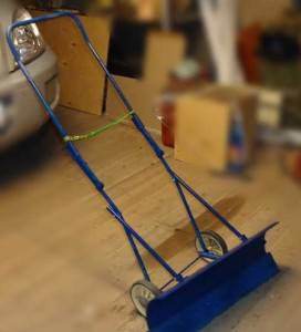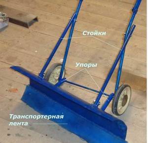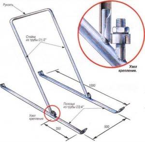 Puede mejorar la herramienta poniéndola sobre los esquís. Para hacer esto, los patines de una esquina de acero con una longitud de 1 m se unen al mango en forma de U en la parte inferior. Los extremos deben doblarse hacia arriba para hacer una apariencia de esquís. La cuchilla raspadora está unida al mango de modo que el extremo inferior de la hoja de aluminio esté sobre las guías.