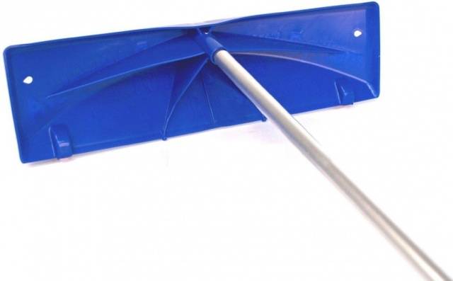 Según el principio de funcionamiento, un raspador de plástico se parece a una cuchilla, solo que no tiene ruedas. La base de la herramienta es un plano rectangular con refuerzos. Un mango se fija en el centro del raspador en la parte superior. Durante el trabajo, una persona simplemente empuja la nieve lejos de sí misma con un elemento de plástico o la recoge sobre sí misma.