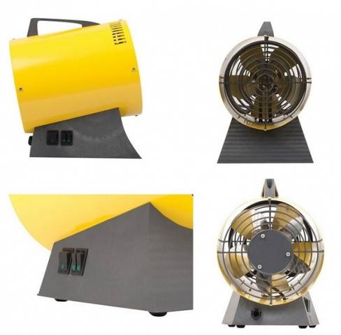 - Los aparatos que funcionan con electricidad se utilizan comúnmente para calentar viviendas y otros locales. En el sitio de construcción, prácticamente no se utilizan. El dispositivo y el funcionamiento del dispositivo se asemejan a un calentador de ventilador eléctrico. Un elemento calefactor está instalado dentro de la caja cilíndrica o rectangular. El ventilador empuja el aire a través del calentador, que se dirige con un flujo dirigido a través de la boquilla de la pistola hacia el objeto. Los cañones eléctricos tienen el costo más bajo entre las unidades impulsadas por otro tipo de combustible. Durante el funcionamiento, el aparato no quema oxígeno, pero no se puede utilizar en instalaciones donde no hay conexión eléctrica.