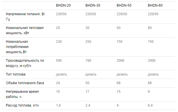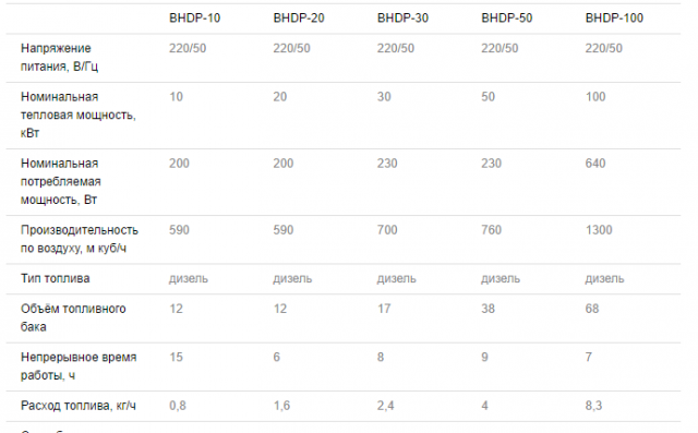 Los electrodomésticos diésel de esta marca tienen dos series: BHDP y BHDN. La última letra de la marca se puede usar para determinar el tipo de calentamiento: P - directo y N - indirecto. Los calentadores diesel son de gran tamaño. Para moverlos, están equipados con ruedas. La serie BHDP está representada por modelos potentes. Sus características se presentan en la tabla.