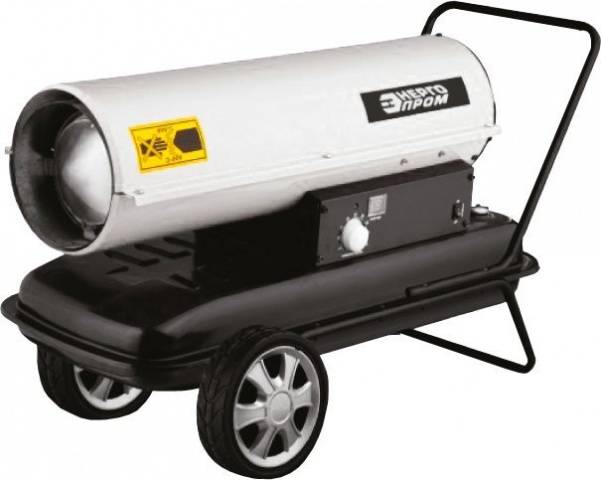 El diseño más simple de una pistola de calor diesel de fuego directo con una eficiencia del 100%. La unidad consta de una caja de acero, dentro de la cual hay un ventilador eléctrico y una cámara de combustión. Hay un tanque de combustible diesel debajo de la carrocería. La bomba es responsable del suministro de combustible. El quemador está en la cámara de combustión, por lo que no sale fuego abierto por la boquilla del cañón. Esta característica del dispositivo permite el uso de un motor diesel en interiores.