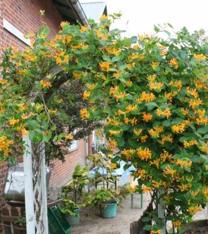 En el diseño del paisaje, se usa una planta tan maravillosa como la madreselva madreselva. para jardinería vertical... Dado que se trata de una liana, definitivamente necesita apoyo para un mayor crecimiento. Los jardineros decoran cenadores, arcos, cercas con madreselva rizada y decoran dependencias. Madreselva madreselva puede ser un seto. Se combina idealmente con coníferas, arbustos que florecen con la misma belleza (naranja falsa, weigela, deytsia) y rosas trepadoras. Para ver ejemplos del uso de madreselva en el diseño de paisajes, vea la foto:
