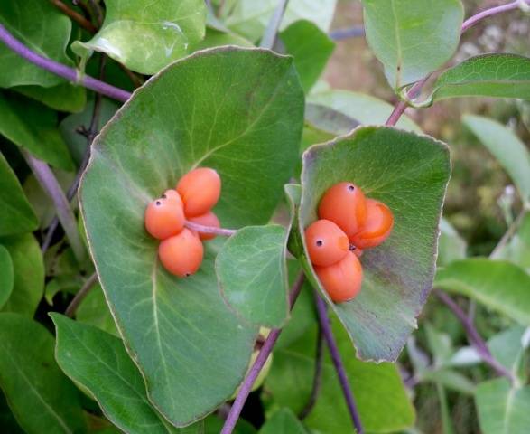Caprifol es una planta asombrosa en la que todo es digno de atención. Hojas de liana inusuales: bastante grandes, coriáceas, elípticas, de color verde oscuro, gris grisáceo a blanquecino por debajo. Caen a finales de otoño. 2-3 pares de hojas superiores crecen juntas para formar un disco a través del cual pasa el tallo de la madreselva.