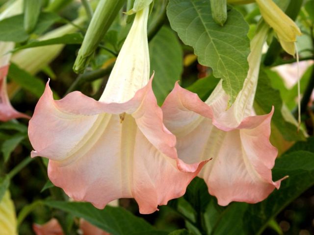 La característica principal y más notable de la brugmansia son sus flores: grandes campanas caídas de hasta 25 cm de longitud y con una campana ancha de hasta 20 cm. Dependiendo de la variedad, las flores pueden ser blancas, rosadas o amarillas y se caracterizan por un fuerte aroma embriagador. Brugmansia florece varias veces por temporada y es muy exuberante: se pueden formar hasta 300 flores individuales en un arbusto bien desarrollado en una carrera.