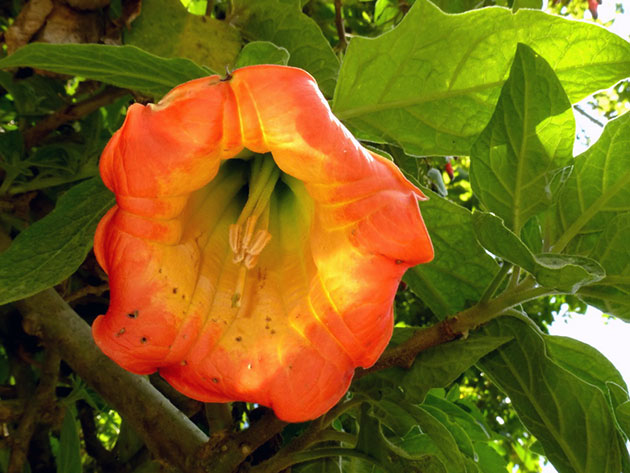 La brugmansia rojo sangre o sanguinolenta es un árbol alto en flor de hasta 12 m de altura. La planta recibió su nombre por la sombra de las flores, son de color naranja con vetas amarillas y un ribete rojo en esta variedad de Brugmansia. La variedad se caracteriza por una mayor resistencia a las heladas, pero sigue siendo muy sensible al frío.