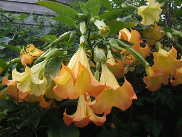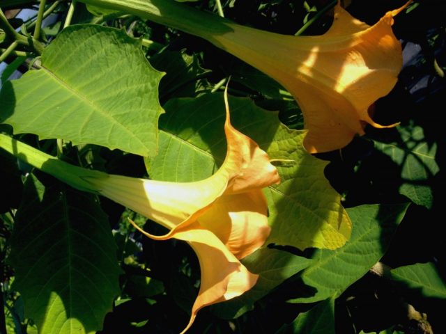 Variedad ornamental con muchas variedades, se distingue por su alto crecimiento hasta 6 my hermosas flores amarillas con amplias cuencas. Un rasgo característico de la brugmansia dorada son sus hojas suaves muy grandes, que pueden alcanzar hasta 50 cm de longitud.