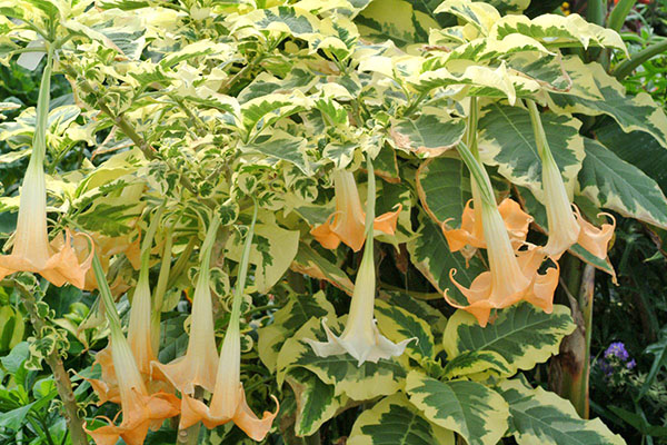 Esta variedad puede considerarse la más inusual: la brugmansia multicolor alcanza hasta 4 m de longitud y trae flores enormes de hasta 50 cm cada una.Al mismo tiempo, en las plantas jóvenes, las flores son blancas o crema suave, y en una brugmansia abigarrada adulta, se vuelven melocotón o incluso naranja. Otra característica es el color inusual de las hojas de las flores, decoradas con un delicado ribete crema.
