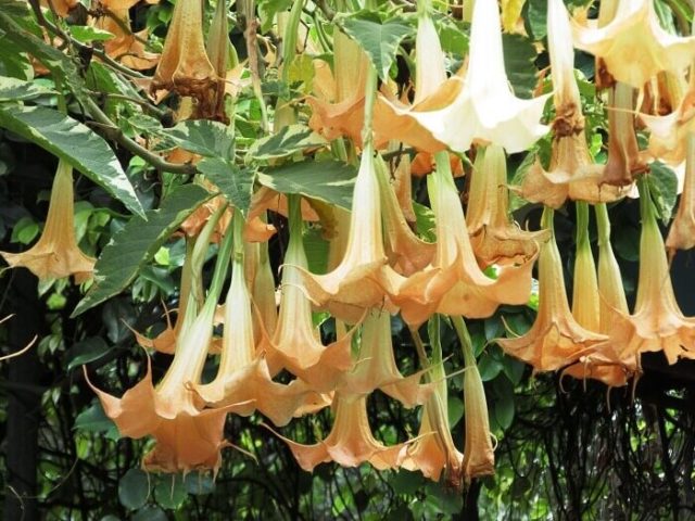 En la foto del cultivo y el cuidado de la brugmansia, puede asegurarse de que la floración de una planta tropical sea realmente sorprendente. En un arbusto pequeño bien desarrollado, pueden florecer 100-300 flores grandes al mismo tiempo: campanas enormes en pedúnculos largos. En longitud, las flores alcanzan un promedio de 25-30 cm, en la campana su diámetro es de aproximadamente 17 cm, las flores caen.