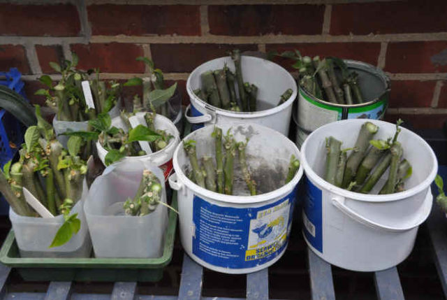 Para la cosecha de primavera se utilizan únicamente brotes jóvenes de hasta 20 cm de largo, de los que se cortan las hojas inferiores y se coloca el brote en un recipiente con agua, que se tapa con una botella de plástico. El cuello y el fondo de esta botella están cortados.