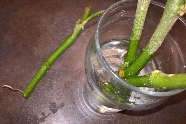 Los esquejes cortados deben colocarse en un sustrato que sea una mezcla de tierra de jardín y perlita. Si el enraizamiento se realiza en invernadero, no es necesario cubrir los esquejes. Si el enraizamiento se realiza en casa, cubra la caja con esquejes con papel de aluminio. La duración del proceso de enraizamiento puede ser bastante larga, hasta 1,5 meses.