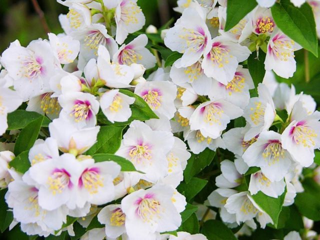 Se forman inflorescencias sueltas de 5-9 yemas en brotes laterales cortos. Las flores son grandes, ahuecadas, de 2 a 4 cm de diámetro, son simples, con 4-5 pétalos bellamente cóncavos, semidobles y dobles. El color de la corola es predominantemente blanco, hay setas simuladas de Lemoine con tonos crema lechosos, así como con tintes rosa burdeos en el centro. La combinación de pétalos grandes y elegantemente curvados y estambres largos de color amarillo crema le da a las flores ligereza visual. La mayoría de las variedades tienen un intenso aroma a flores. Los cogollos de diferentes variedades florecen desde mediados hasta finales de junio. La floración suele durar de 10 a 20 días.