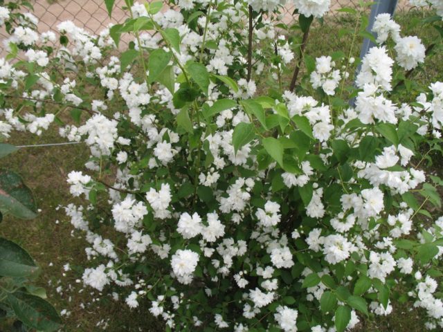 Popular, según las reseñas, es Lemoine Minnesota Snowflake. Los potentes brotes erectos de la variedad forman una corona vertical ovalada de hasta 2 m de altura y 1,5 m de diámetro. Las grandes hojas de color verde oscuro crean un fondo expresivo para las flores dobles blancas como la nieve, recogidas en pinceles de varias piezas. Diámetro de la corola hasta 2,5 cm. Variedad temprana, los brotes comienzan a florecer en mayo. Es preferible comprar los plantones Minnesota Snowflake de Lemoine Chubushnik en un tubo. Este embalaje garantizará el transporte seguro de las raíces.