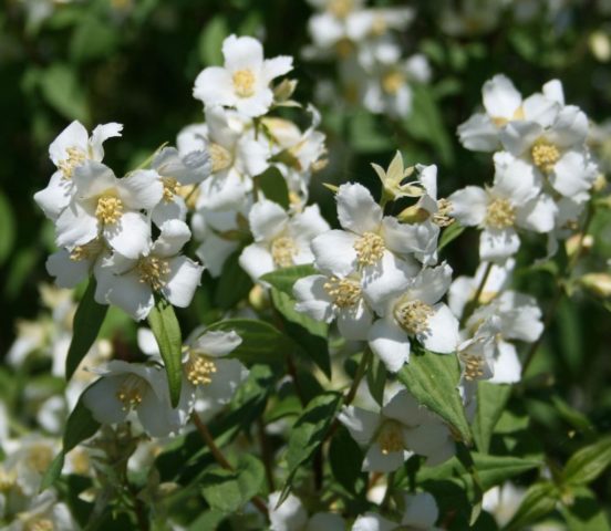 El arbusto que se extiende se distingue por una gran cantidad de brotes arqueados, que en diferentes variedades alcanzan de 1 a 3 m de altura. Los troncos con una corteza lisa de color marrón grisáceo, en los que aparecen grietas con la edad, son bastante delgados y flexibles. Los arbustos de tallos múltiples de la naranja falsa de Lemoine, como en la foto, son de densidad media, con un ancho de copa de hasta 1,5-2 m. La longitud de las hojas ovoides de color verde claro es de 4-7 cm. La luz y en al mismo tiempo, la rica sombra del follaje le da al arbusto un aspecto pintoresco incluso después de la floración.