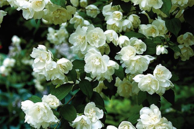 La variedad Girandole (Candelabro) fascina con una copa ancha, de hasta 120 cm de diámetro, con brotes caídos, de 150 cm de altura, y flores dobles de color blanco cremoso con un delicado aroma. Chubushnik es resistente, tolera heladas hasta 30 ° С.