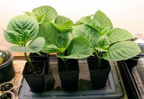 Una vez que las raíces han cortado, los esquejes se plantan en el sustrato a una distancia de unos 5 cm entre sí. A una temperatura de unos 20 ° C, después de un mes, la hortensia echa raíces.