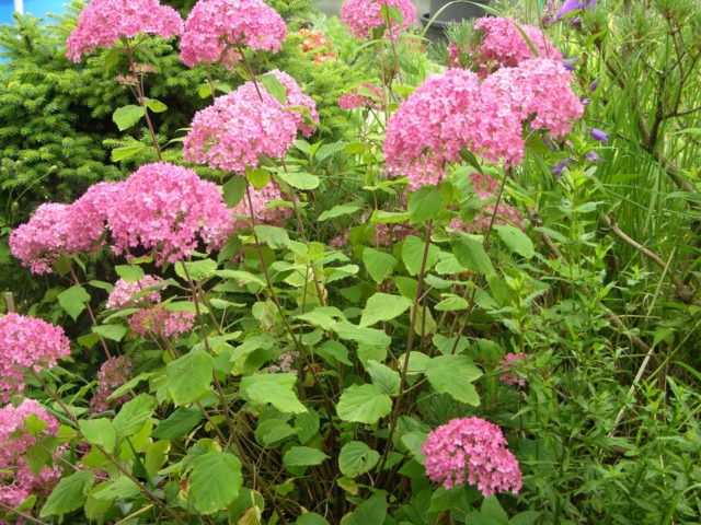 La decoración de la hortensia se conserva durante todo el período de floración, ya que los pétalos se queman al sol, los pétalos cambian de tono de frambuesa a rosa pálido.