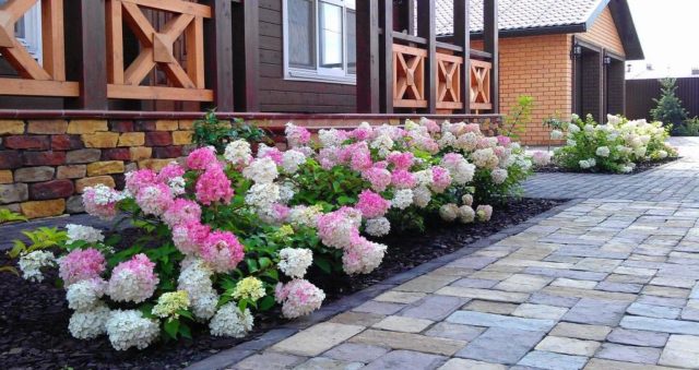 - Pinky Winky y otras variedades de hortensias a menudo se colocan al lado del banco.