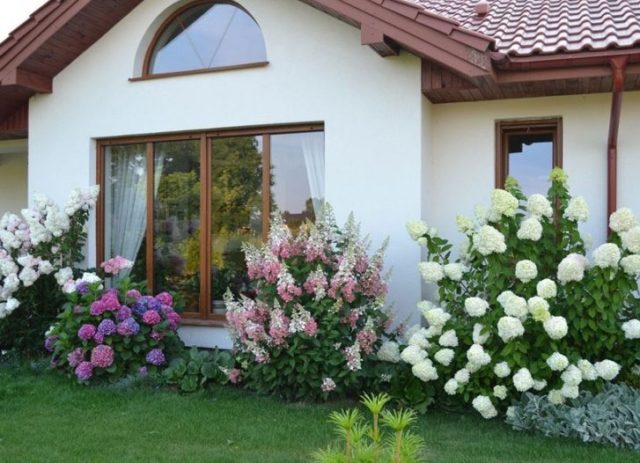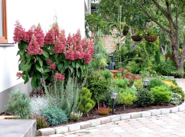 - La hortensia también se puede usar con otras plantas en un macizo de flores común: dado que el resto de flores y arbustos no son tan altos, es mejor plantarlos al frente.