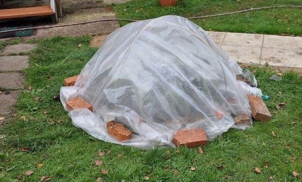 Uno de los refugios más simples son las láminas de plástico fijadas con ladrillos.