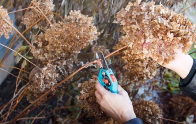 Las inflorescencias secas de Hydrangea paniculata no se pueden dejar hasta la primavera.