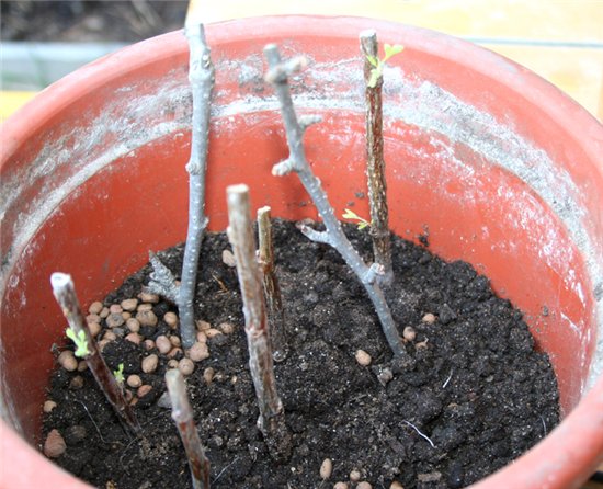 Un día después de sumergirse en un estimulador de crecimiento, el material se planta en camas especiales, escuelas, donde se usa una mezcla de arena y turba como suelo. Los recipientes se cubren con una envoltura de plástico o una tapa de plástico. Durante el proceso de enraizamiento, es importante ventilar periódicamente los esquejes e irrigar el suelo. En la primavera, por regla general, se dedican a plantar en un lugar de crecimiento permanente.