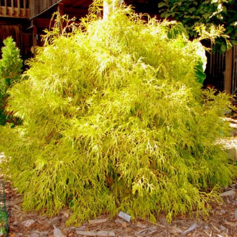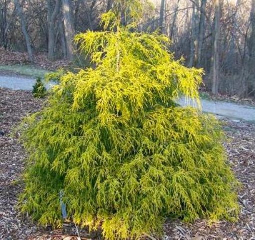 El ciprés de guisante Filifera Aurea es una planta alta que crece hasta 5 m de altura. La corona cónica ancha está formada por brotes filamentosos cubiertos con agujas de color amarillo brillante y suave. La planta requiere luz; cuando se cultiva a la sombra, pierde su apariencia decorativa.