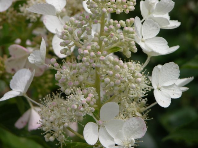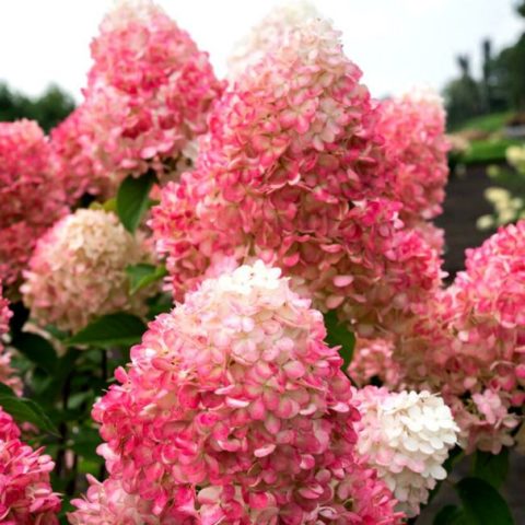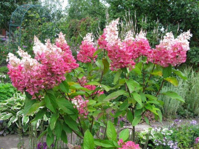 Las inflorescencias de la hortensia de panícula tienen forma de cono, alcanzan los 30 cm de longitud y consisten en flores pequeñas y de olor agradable. Inicialmente, su color es crema, pero gradualmente cambia a rosa fuerte. Después del inicio de las heladas, los brotes no se cortan: dan a los arbustos volados un aspecto decorativo.