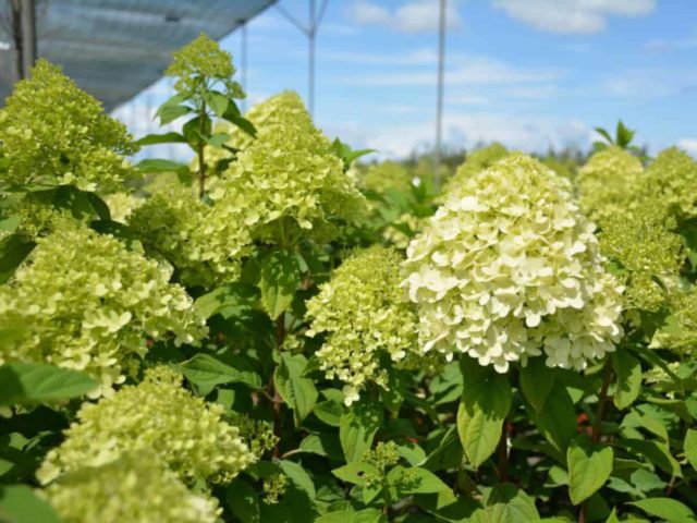 Entre otros representantes de la familia Hortensiev, esta especie se obtuvo por casualidad.La planta es de tamaño insuficiente, su altura es de 0,7-0,8 m El arbusto es compacto, en los brotes superiores hay pinceles de flores de un agradable tono verde claro. A la luz del sol, se vuelven pálidos y se vuelven casi blancos. En los meses de otoño, vuelve el tono original, pero se puede ver un color rosado alrededor de los bordes de los pétalos. Los brotes se forman en un número tan grande que las hojas son prácticamente invisibles desde junio hasta el inicio de las heladas.