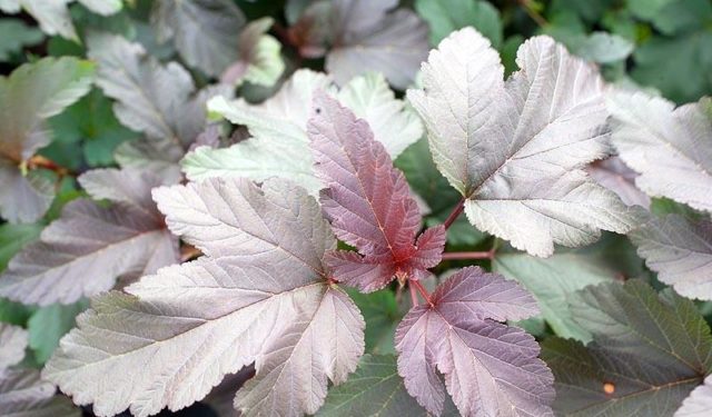 Los arbustos de la vesícula de viburnum se están extendiendo. La disposición inclinada de las ramas en Purpurea hace que la forma de la corona parezca una bola, alcanzando un diámetro de uno y medio a dos metros. Este tipo de vesícula debe su nombre al color rojizo del follaje. El color púrpura de las hojas, que tienen tres o cinco lóbulos, no cambia durante el verano y el otoño.