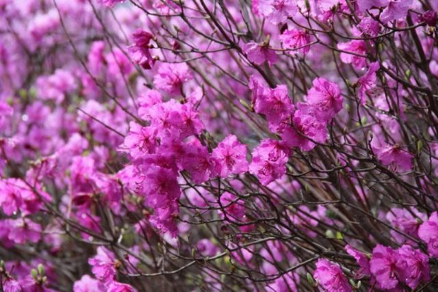 El rododendro dahuriano o romero silvestre es un arbusto de flores perenne. La planta pertenece a la familia de los brezos, alcanza una altura de 2-3 m. La decoratividad del arbusto está dada por una copa muy ramificada y extendida, que a mediados de la primavera se cubre de grandes flores de color púrpura. Al ver una vez un arbusto en flor en condiciones naturales, todos quieren plantar una planta sin pretensiones en su parcela personal.