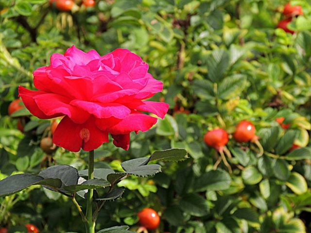 Entre las similitudes y diferencias entre rosas y escaramujos, cabe destacar una característica más. En los brotes de casi todas las especies de este último, se forman frutos anaranjados o rojos. En las rosas, se encuentran solo en variedades silvestres. Maduran desde mediados de agosto hasta principios de septiembre, lo que permite distinguir los arbustos.