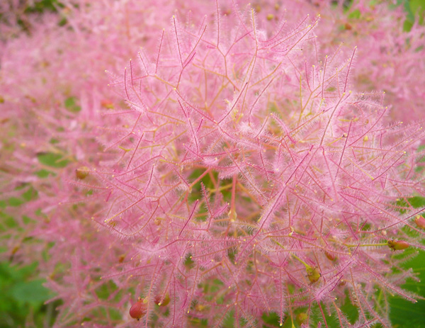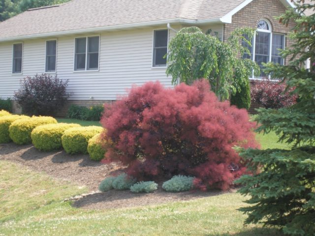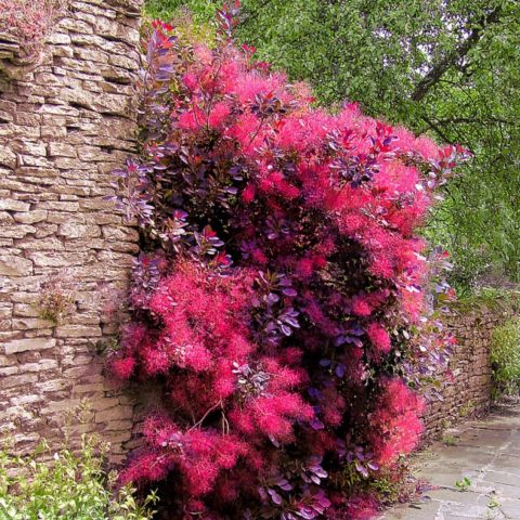 El cuero de Skumpia Cotinuscoggigria Royal Purple es un arbusto caducifolio vertical de múltiples tallos de la familia Sumakhov. Tiene una corona compacta de ancho ovalado, crece hasta 5 m de altura. El sistema de raíces de la scumpia Royal Purple es poderoso, ramificado y profundamente penetrante. Las ramas están cubiertas de corteza de color marrón parduzco. Los brotes jóvenes son verdosos o rojizos por un lado; cuando se rompen, secretan jugo lechoso. Las hojas del arbusto scumpia púrpura real son ovaladas, brillantes, en varios tonos de burdeos con un borde rosado alrededor de los bordes. Las flores son bisexuales, pequeñas, rosadas, recogidas en grandes panículas sueltas. Cuando se caen, los pedicelos alargados se cubren con finos pelos rosados, burdeos o rojos.