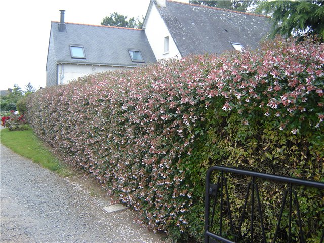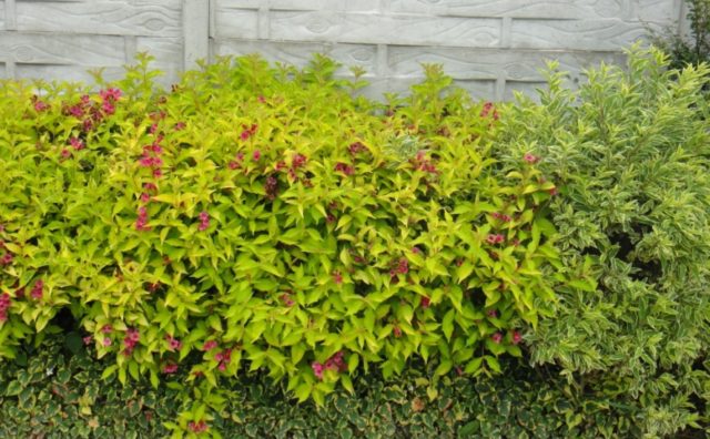 Las variedades de flores de weigela de bajo crecimiento Nana Variegata y Aurea, coreanas altas, que alcanzan una altura de 2,5 m, capaces de volver a florecer a finales del verano y principios del otoño, son las más adecuadas para los setos.