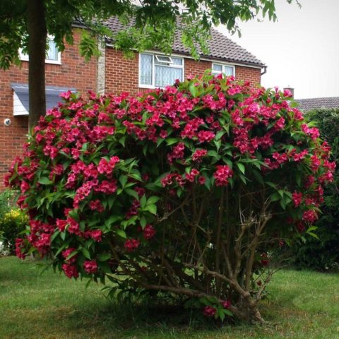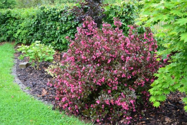 Un monogrupo de variedades de bajo crecimiento de Weigel Carnival, Alexandra, Nana Variegata y Bristol Ruby se verá armoniosa. Un arbusto con hermosas flores en un diseño de paisaje de jardín también puede decorar la pared de una casa con su lujo en una compañía con árboles de hoja perenne y grupos de flores en primer plano. Las variedades altas se ven hermosas en plantaciones individuales en el área del césped, en primer plano entre las coníferas, como un seto al plantar alrededor del perímetro del sitio.