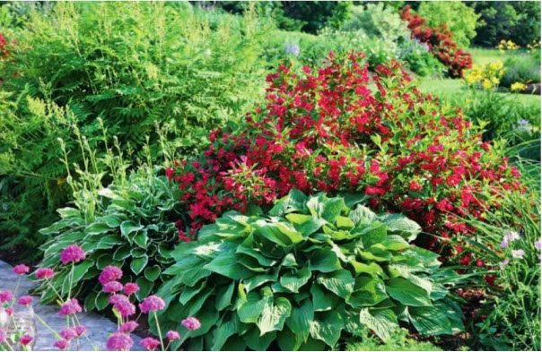En los bordes mixtos, que se pueden decorar en un estilo natural o austero, la weigela en el diseño del paisaje del jardín se ve muy bien con plantas perennes en flor y con grupos de árboles y arbustos. Se puede combinar con los siguientes cultivos herbáceos: