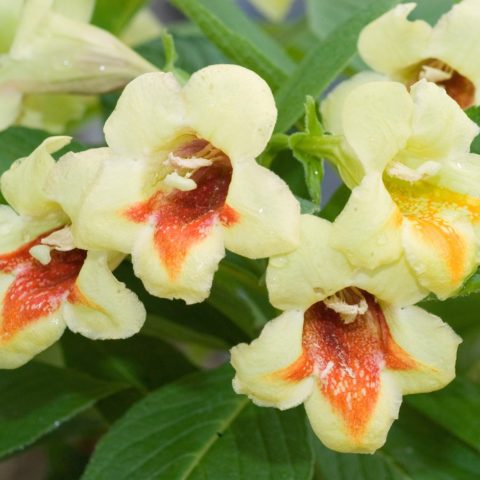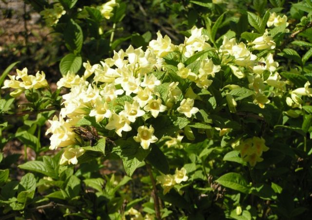 Los primeros brotes se forman en la parte superior de los tallos del año pasado, al final del verano en los brotes del año en curso. Weigela florece con flores grandes individuales, con menos frecuencia se recolectan en inflorescencias de 2-3 piezas. En forma de embudo o tubular en forma de campana. El color durante la floración cambia de amarillo brillante a limón claro.Una mancha de frambuesa brillante en el medio de la garganta hace que la flor sea decorativa.