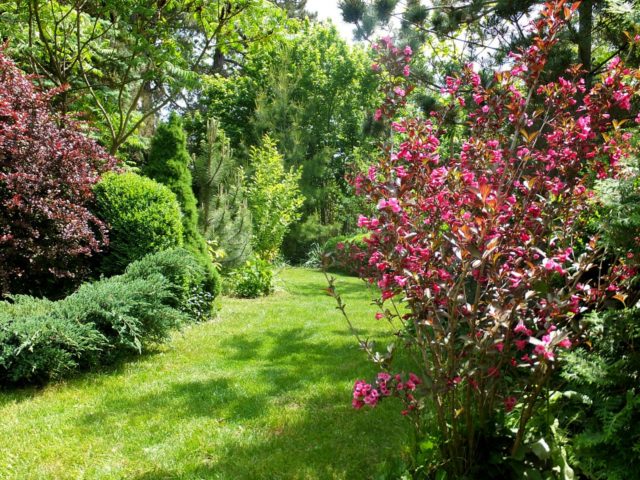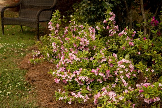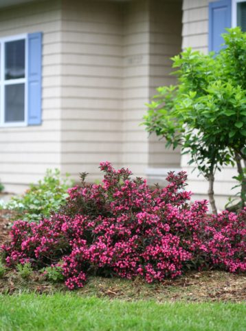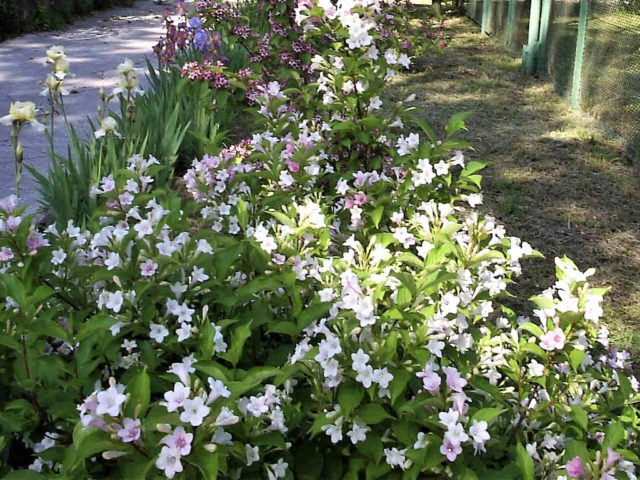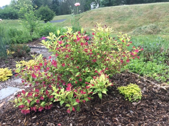 Las variedades de Weigela se ven armoniosas en cualquier composición: en plantaciones masivas y como un solo arbusto.