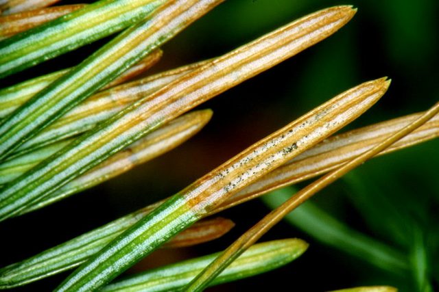 Puede reconocer la mosca de sierra por el color amarillento y el desprendimiento de las agujas; tras un examen detenido en mayo y junio, se encontrarán larvas de color amarillo pálido en los brotes. Puede deshacerse de la plaga con la ayuda de agentes insecticidas: Actellik, Decis y Fury, es necesario procesar las coníferas de la enfermedad desde principios de mayo y durante todo el verano con interrupciones.