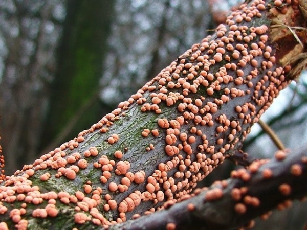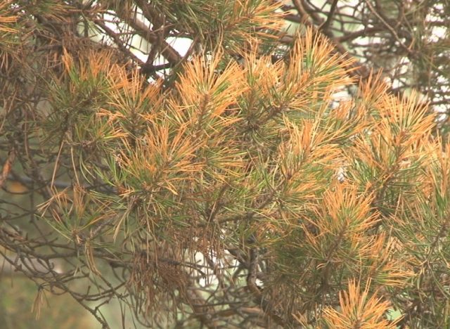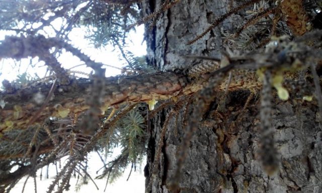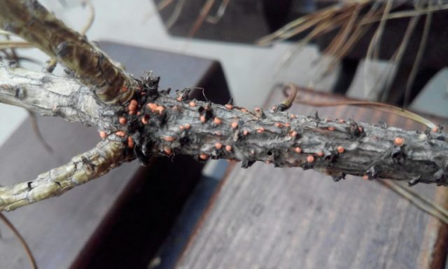 Otra enfermedad de las coníferas se manifiesta en forma de numerosos crecimientos microscópicos de color rojo anaranjado que aparecen en la superficie del tronco. Gradualmente, los crecimientos se vuelven más oscuros y se secan, la corteza comienza a morir y las agujas se vuelven amarillas y se caen.