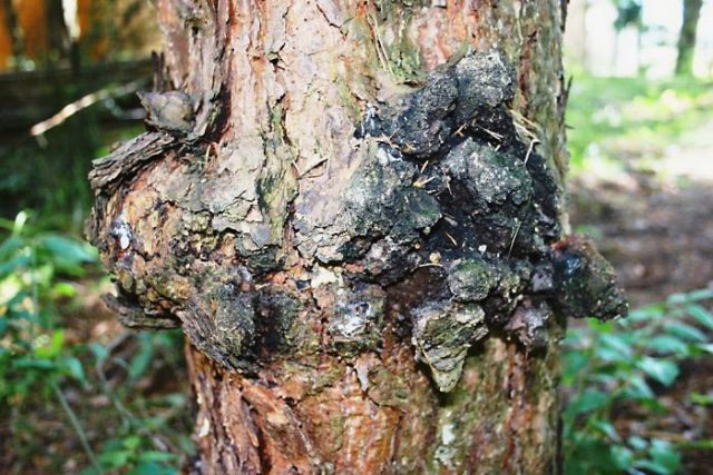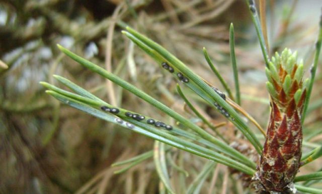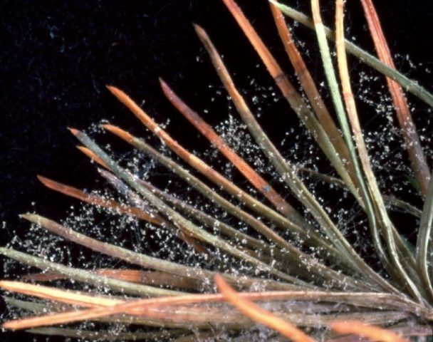 Como su nombre lo indica, las enfermedades fúngicas afectan principalmente a los pinos. Su acción se manifiesta en el hecho de que los brotes laterales de la planta están fuertemente curvados y el brote apical muere. Al mismo tiempo, aparecen inflamaciones de color amarillo anaranjado ubicadas en cadenas en las agujas. El desarrollo de la enfermedad conduce al hecho de que el crecimiento del árbol de coníferas se detiene y, después de un tiempo, el pino puede morir.