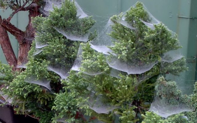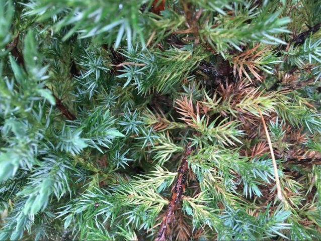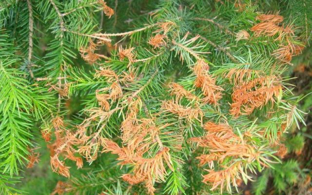 Un pequeño insecto llamado hermes es una de las plagas más comunes y peligrosas. El insecto se posa en los brotes de pinos, enebros, abetos y cualquier otra conífera en colonias enteras, pone huevos y se alimenta de la savia de los árboles. Las larvas de Hermes dañan los brotes jóvenes de las coníferas y, con el tiempo, la planta muere. La presencia de Hermes puede sospecharse por el color amarillento de las agujas y la ralentización del crecimiento de los árboles; si se examina más de cerca, se encontrarán insectos microscópicos, como si estuvieran cubiertos de pequeñas pelusas, y las larvas de Hermes en las agujas.