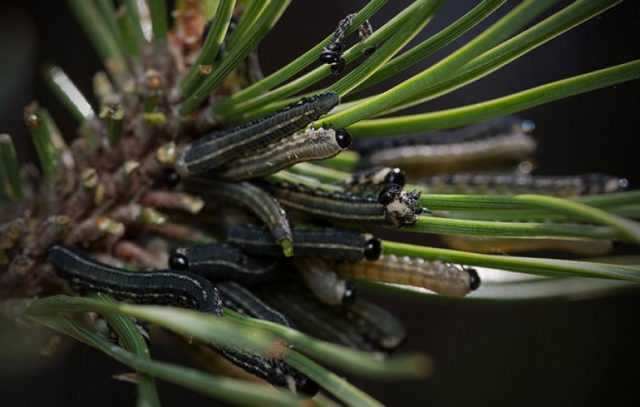 El insecto mariposa afecta principalmente a los pinos, pero también puede habitar otras coníferas. El peligro para los árboles no es el gusano de seda en sí, sino sus larvas, largas orugas de un color gris pardusco. Las larvas del gusano de seda del pino aparecen a mediados de marzo y se alimentan de los jugos de la planta conífera, causándole daños hasta finales de junio. Bajo la influencia de las larvas de la mosca de sierra, la efedra pierde una parte significativa de las agujas y, a veces, las colonias de la plaga comienzan a comer incluso la corteza.