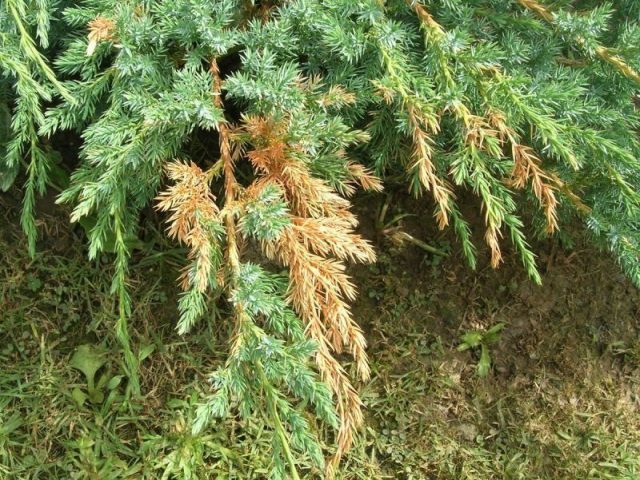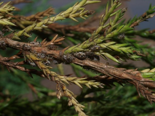 Las vainas son insectos que afectan principalmente a enebros, tuyas y tejos. La plaga parece un pequeño insecto con un caparazón-escudo de color marrón brillante, afecta principalmente a los brotes más cercanos a la mitad de la corona. Bajo la influencia de la vaina, las agujas adquieren rápidamente un color marrón y se desmoronan y, además, la vaina provoca la curvatura y el secado de los brotes.