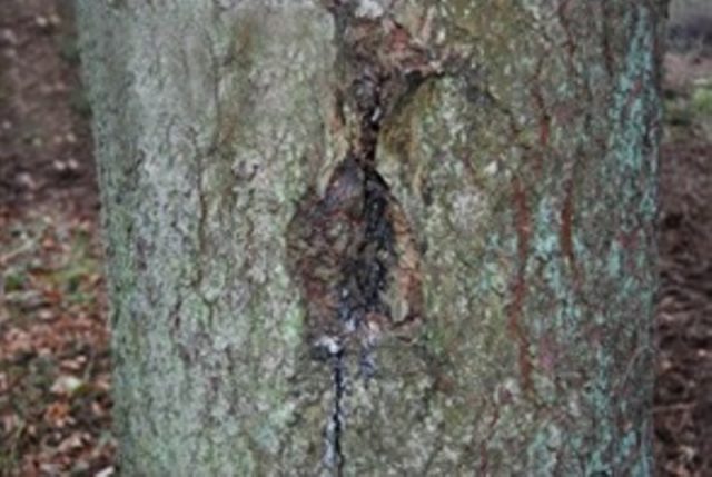 La enfermedad afecta principalmente a enebros, tuya y pinos jóvenes, y los síntomas se manifiestan por el secado de la corteza del tronco del árbol y la aparición de crecimientos marrones y negros en el mismo. Las agujas de las plantas adquieren un tinte amarillo y se desmoronan, los brotes comienzan a secarse y doblarse.