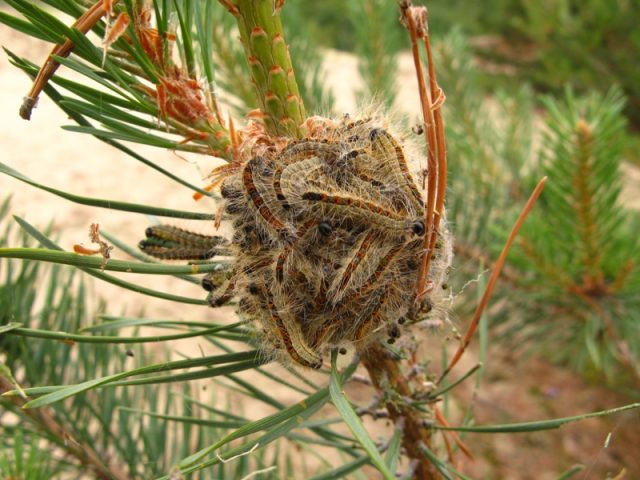 Otra plaga peligrosa que se alimenta de las agujas y los cogollos de los pinos jóvenes es una oruga llamada pala de pino. A pesar de que el período de alimentación del insecto es de solo 30 a 40 días, durante este tiempo la pala puede causar daños graves al pino: dañar las agujas, los brotes frescos y los brotes, provocando así el secado de la planta.