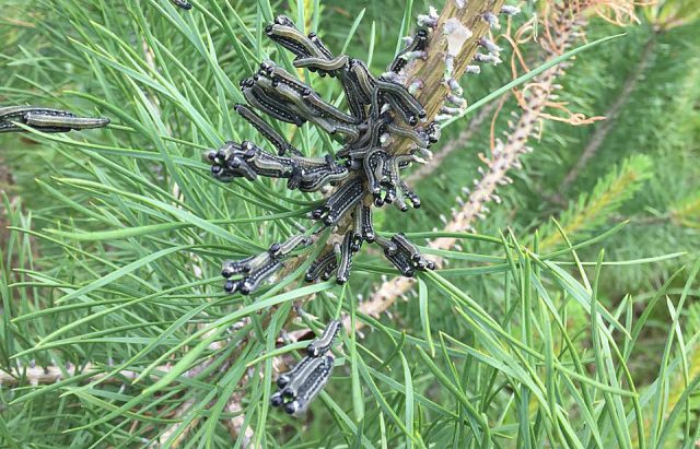 La plaga está formada por pequeñas larvas verdes de unos 8 mm de longitud que viven en los brotes de pino y se alimentan de las agujas de pino.El trabajo de una mosca de sierra de pino se puede ver en un pino desde lejos, la enfermedad se manifiesta como manchas amarillas en la copa. Si te acercas, encontrarás que las agujas de pino no solo están secas, sino que también están retorcidas y picadas por una plaga.