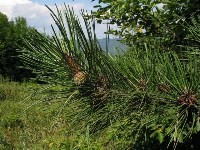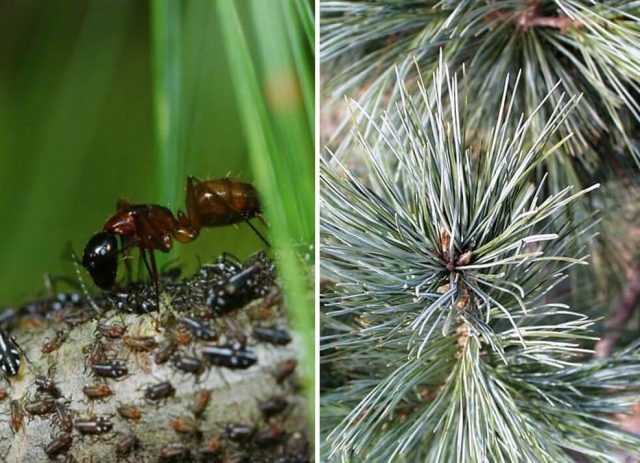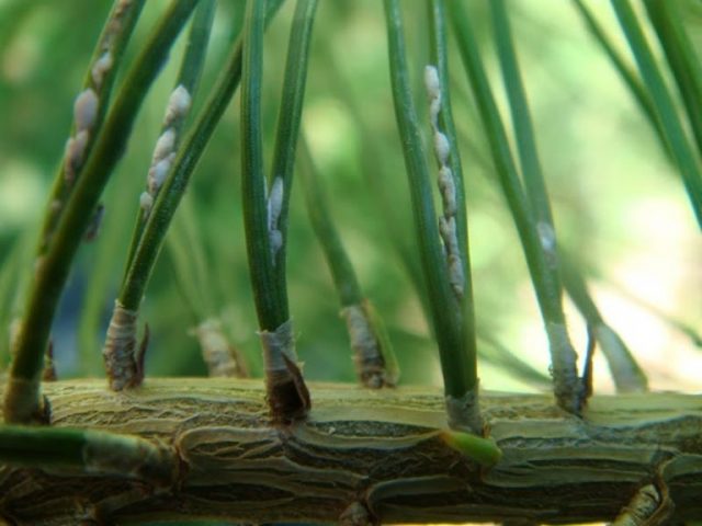 La plaga del pulgón del pino pardo es un gran peligro, ya que suele afectar al árbol en grandes colonias. Al mismo tiempo, en primavera, los pulgones se encuentran principalmente en brotes jóvenes, pero en verano se mueven a ramas viejas más gruesas y, por lo tanto, representan una amenaza para toda la planta. Un síntoma de la aparición de pulgones es el oscurecimiento de las agujas: las agujas se rizan, se secan y adquieren un color marrón oscuro.