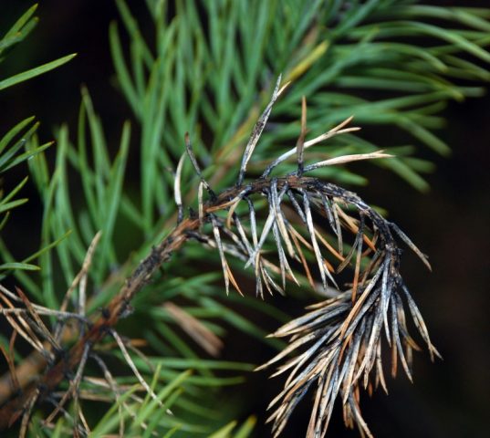 Las medidas de tratamiento son eliminar completamente las ramas afectadas y tratar el pino con una solución de líquido de Burdeos al 1%. Se recomienda el mismo remedio para la prevención de enfermedades si el pino crece en un área poco iluminada y en condiciones de alta humedad.