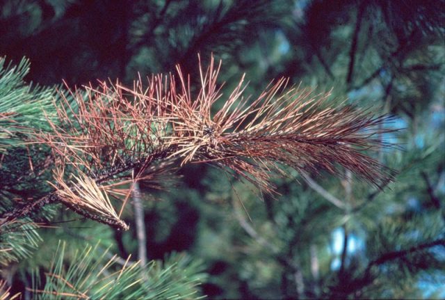 Los agentes causantes de la enfermedad son los hongos Sphaeriapithyophila Fr. y otros, que aparecen con mayor frecuencia en la segunda mitad del verano y afectan a las ramas bajas de los pinos. La necrosis provoca el marchitamiento local de las áreas de la corteza en las ramas jóvenes y la desecación de los brotes; con una enfermedad avanzada, el hongo también puede infectar los brotes y las agujas y moverse, incluso a las ramas medias y superiores. Si no se trata, en última instancia, la necrosis conducirá a la muerte de todo el pino.