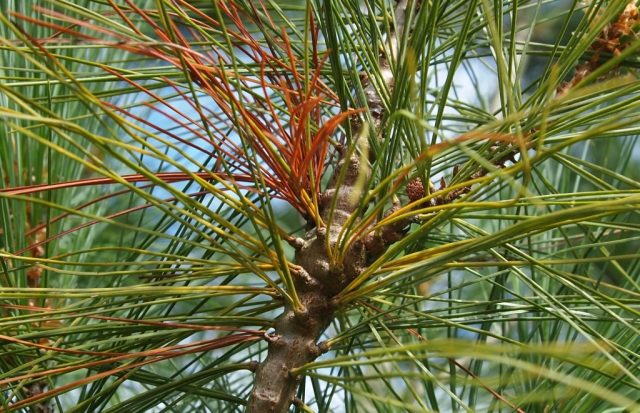 Una enfermedad causada por un hongo llamado Colletotrichumgloeosporiordes se manifiesta en un cambio en el color de las agujas de pino. En las primeras etapas de la enfermedad, aparecen manchas negras microscópicas y rayas transversales en las agujas, y posteriormente las agujas adquieren un color gris o marrón. La enfermedad conduce al desprendimiento de las agujas y al debilitamiento del árbol, por lo que el pino necesita un tratamiento oportuno.